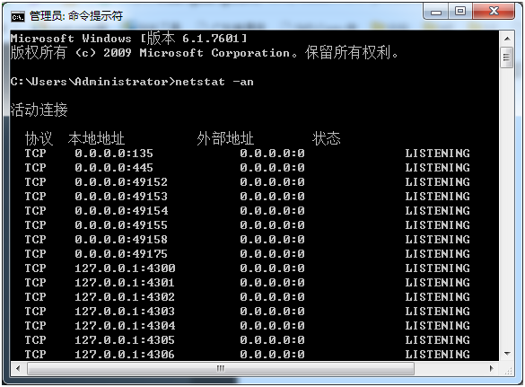 在圖2的顯示結(jié)果中,有4列,第1列為協(xié)議,第2列為本地地址及端口,第3列為目標(biāo)地址及端口,第4列為當(dāng)前狀態(tài)。例美國(guó)服務(wù)器利用 netstat -an命令,以數(shù)據(jù)形式顯示所有開(kāi)放端口。命令執(zhí)行情況如圖3所示: